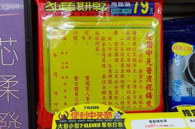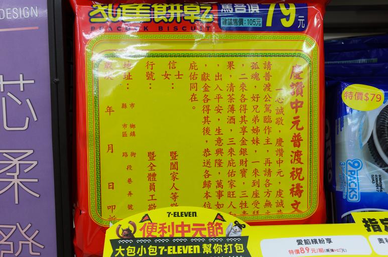 Keywords: Sacrificial Writing for Ghost Festival on Package of Peacock Biscuit 20160724.jpg zh-tw 孔 餅乾包 上的慶讚中元普渡 禱文, 於統 超商鑫壽 市(146964) 2016-07-24 19 58 58 own 玄史生 other versions Ghost Festival in Taiwan Kuai Kuai Confectionery of Taiwan 玄史生写 文庫 Taken with Nikon Coolpix A cc-zero |