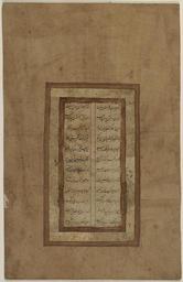 Keywords: Sadi5.jpg Script nasta'liq These calligraphic fragments are the first seven pages of Sa'di's Bustan The Fruit Garden or The Orchard The order of the first seven pages of this work all belonging to the same manuscript goes as follows Page 1 1-04-713 19 26 Page 2 1-04-713 19 15 Page 3 1-04-713 19 14 Page 4 1-04-713 19 12 Page 5 1-04-713 19 13 Page 6 1-04-713 19 11 Page 7 1-04-713 19 25 Page 5 The sixth and seventh lines of poetry eulogize the incomprehensible qualities of God Genius reaches not the substance of His nature / Thought reaches not the profundity of His qualities / One can attain to the Arab poet Suhban in eloquence / But one cannot reach the substance of the Praised One God This copy of the Bustan may have been produced in India during the 17th century The back of the second page 1-04-713 19 15 of this series includes a note supporting this provenance as it states that the work was written by 'Abd al-Rashid Daylami He was one of the famous calligraphers active at the court of the Mughal ruler Shah Jahan r 1627-1656 in Agra and Delhi ascs 009 century 17 Calligrapher 'Abd al-Rashid Daylami attr PD-old Other pages in this set <gallery> File Sadi1 jpg Page 1 File Sadi2 jpg Page 2 File Sadi3 jpg Page 3 File Sadi4 jpg Page 4 File Sadi6 jpg Page 6 File Sadi7 jpg Page 7 </gallery> Bostan |