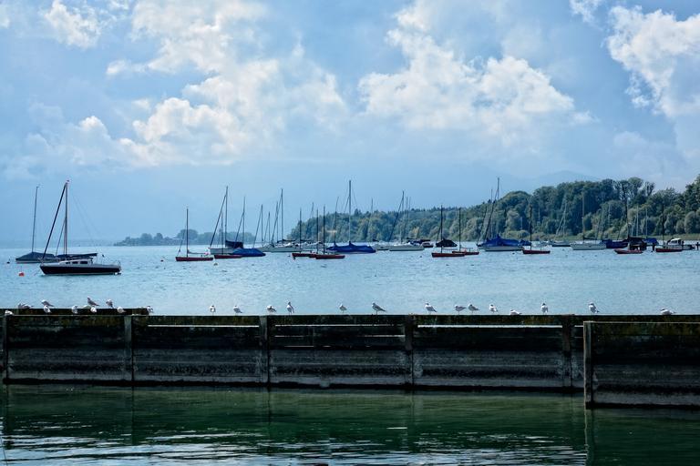 Keywords: sailing boats port boats boat masts masts lake chiemsee anchorage anchor quiet sailing vessel still sky clouds blue maritime rest sea concerns coast idyll water peaceful relaxed leisure recovery nature landscape upper bavaria