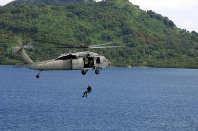 Keywords: Sailor Flies Over Waters of Micronesia DVIDS112675.jpg en Petty Officer 3rd Class Jack Delbridge an aviation warfare systems operator from Atlanta rappels from an MH-60S Sea Hawk helicopter while flying over the waters of Micronesia during Pacific Partnership 2008 Pacific Partnership is a four-month humanitarian mission intended to build collaborative partnerships by providing engineering civic medical and dental assistance to the region 2008-08-31 Petty Officer 3rd Class Michael Barton https //www dvidshub net/image/112675 080831-N-+++++-400 2008-09-03 06 53 CHUUK FM PD-USGov-Military-Navy MH-60S Seahawk Pacific Partnership 2008 Images from DoD uploaded by Fæ |