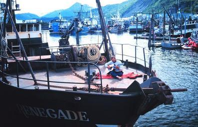 Keywords: Sailor guitar Alaska.jpg en Music - a companion of the sailor - note the survival suit Location St Paul Harbor Kodiak Alaska Category Fisheries/Harbor Scenes/Life Ashore/ National Marine Fisheries Service photo NOAA Photolibrary; Image ID fish0864 NOAA's Fisheries Collection http //www photolib noaa gov/htmls/fish0864 htm Charlie Ess 1997-06 Fishing boats of the United States Fishermen's clothing Fishermen Sailors from the United States 1997 in Alaska People with guitars PD-USGov