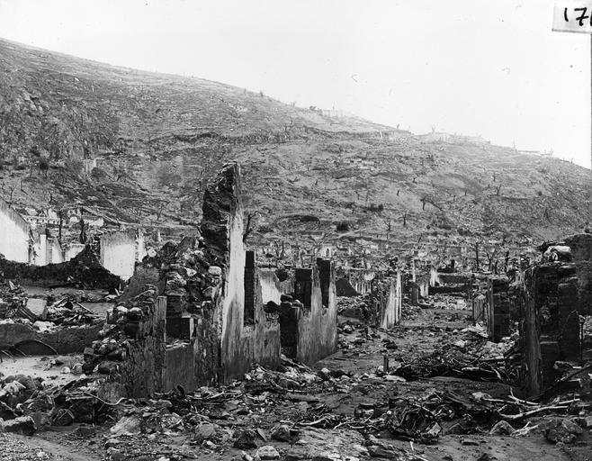 | Keywords: Saint Pierre YORYM-TA0174.jpg View of ruined streets of Saint Pierre after the Mont Pelee eruption of 8th May 1902 Same skyline as TA173 but taken from further south Many dead trees in the background depicted people depicted place Saint-Pierre Martinique 1902 Black and White glass Lantern slide Institution Yorkshire Museum Natural History object history exhibition history credit line Yorkshire Museum York Museums Trust accession number YORYM TA174 The Tempest Anderson Photographic Archive held at York Museums Trust <br> York Museums Trust image PD-old-100 PD-US Uploaded with UploadWizard Images from the Tempest Anderson Collection vulcanology Saint-Pierre Martinique 1902 eruption of Mount Pelée Ruins in Martinique |