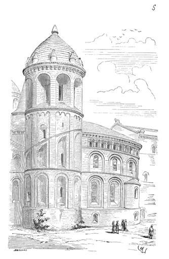 | Keywords: Saint.Sepulcre.png La destruction de ce monument si intéressant comme plan et dispositions architectoniques est fort regrettable Nous devons encore nous trouver heureux d'en avoir conservé l'étage inférieur et d'en pouvoir ainsi constater la date précise le système de structure et d'en tracer le plan Son aspect extérieur conservé par la gravure dans l'ouvrage de D Planchet ne manquait ni de grandeur ni d'originalité Il y avait là fig 5 des réminiscences de monuments antiques et bien certainement du Saint-Sépulcre de Jérusalem Les deux énormes cylindres contenant les escaliers montant aux galeries supérieures allégés extérieurement par des niches étaient évidemment un souvenir de quelque construction romaine Du temps de D Planchet c'est-à-dire en 1739 cet édifice des premières années du XI<sup>e</sup> siècle était encore intact; seuls les couronnements des deux tours d'escaliers avaient été refaits au XII<sup>e</sup> siècle puis réparés à une époque plus récente Dans notre figure ces couronnements sont restaurés Viollet-le-Duc Drawings by Eugène Viollet-le-Duc |