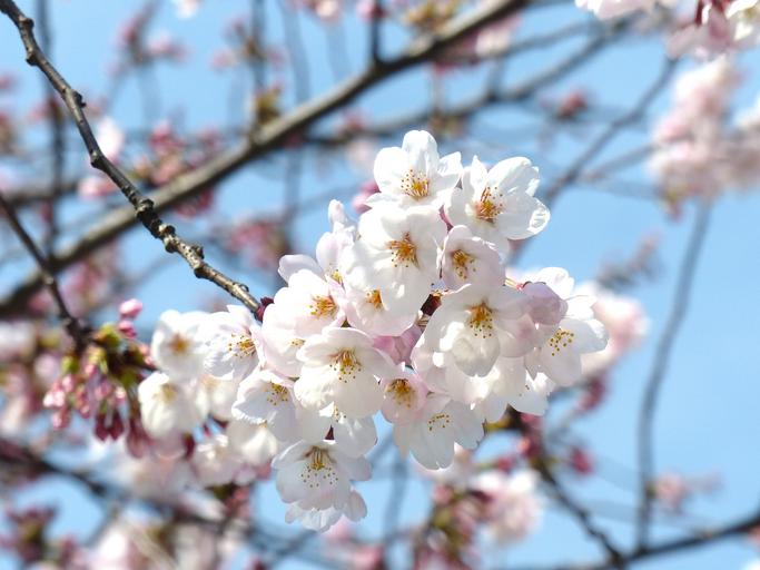 Keywords: sakura cheery blossom sky spring tree pink nature plant white blooming season branch flower petal japan freshness bright leaf