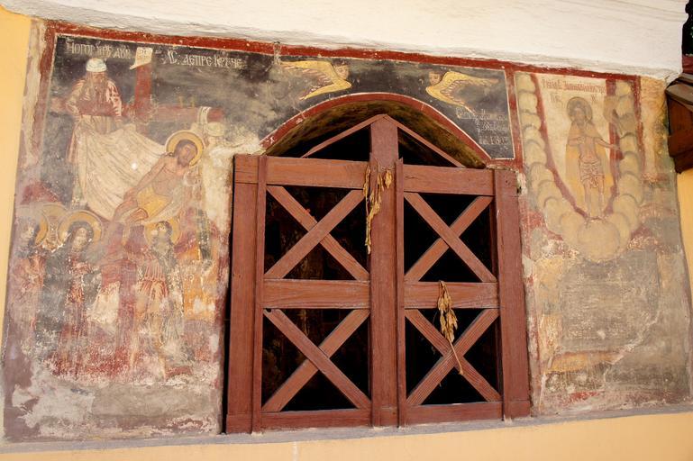 Keywords: saliste romania building structure door entrance wood wooden design stone fresque art drawing painting religious figures outside