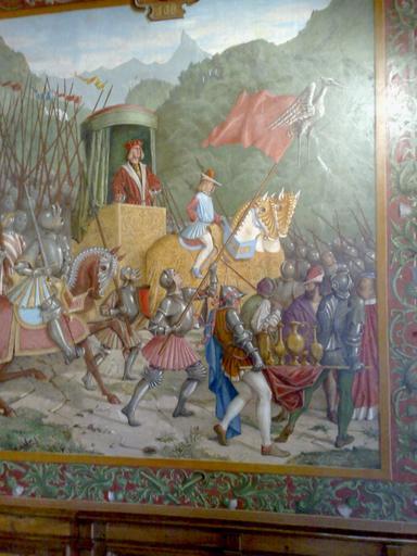 | Keywords: Salle des chevaliers Castle of Gruyères.jpg Salle des chevaliers château de gruyères fresque représentant Gruerius le fondateur légendaire de Gruyères capturant une grue animal héraldique des comtes de Gruyères Own fresque 1852-1862 - Photographie March 2008 Fresque Barthélemy Menn 1815-1893 - Photographie SalomonCeb PD-art Musée du Château de Gruyères Barthélemy Menn | ||||