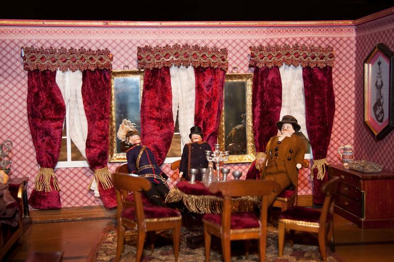 Keywords: salon men toys old antique play children toys dolls houses doll's house historically wood curtains old toys table chairs nostalgia setup miniatures