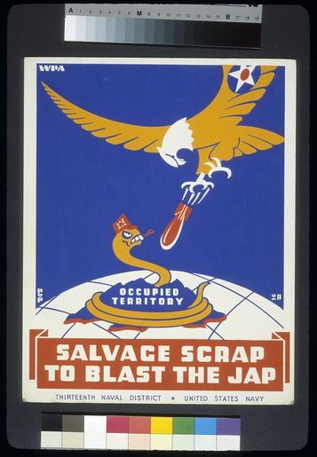 | Keywords: Salvage Scrap propaganda poster orig.tif Poster for Thirteenth Naval District United States Navy showing a snake representing Japan being bombed by an eagle An example of American propaganda during World War II http //hdl loc gov/loc pnp/cph 3b49009 Library of Congress or 1940 1941 Phil Phul File Salvage Scrap propaganda poster orig tif Original TIF File Salvage Scrap propaganda poster orig jpg Original JPG File Salvage Scrap propaganda poster crop2 jpg This version has been restored Rotated with perspective crop Dirt smudges and small creases corrected Histogram adjusted File Salvage Scrap propaganda poster crop2 tif uncompressed restoration PD-USGov World War II propaganda |