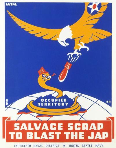 Keywords: Salvage Scrap propaganda poster crop2.jpg Poster for Thirteenth Naval District United States Navy showing a snake representing Japan being bombed by an eagle An example of American propaganda during World War II http //hdl loc gov/loc pnp/cph 3b49009 Library of Congress 1941-12 Phil von Phulhttp //www loc gov/pictures/related/ fi name q Phul 2C 20Phil 20von File Salvage Scrap propaganda poster orig tif Original TIF File Salvage Scrap propaganda poster orig jpg Original JPG File Salvage Scrap propaganda poster crop2 jpg This version has been restored Rotated with perspective crop Dirt smudges and small creases corrected Histogram adjusted File Salvage Scrap propaganda poster crop2 tif uncompressed restoration Assessments 1 Scrap salvage propaganda poster PD-USGov World War II propaganda World War II posters from the United States 1941 in the United States Recycling in the United States in World War II Personifications of the United States Personifications of Japan World War II anti-Japanese propaganda posters from the United States Eagles and snakes in art |