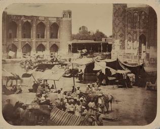 | Keywords: Samarkand Bazaar and Its Types of Vendors. Market Square between Three Madrasahs (Registan) WDL10867.png  Artwork ru Кун Александ Людвигович 1840 1888 гг fr Kun Aleksandr L 1840-1888 en Kun Aleksandr L 1840-1888 zh 亚历山大·L· ,1840-1888 年 pt Kun Aleksandr L 1840-1888 ar كُن، ألكسندر ل ، 1840-1888 es Kun Aleksandr L 1840-1888 ru Сама кандский база и типы то говцев База ная площадь между т ех мед есе Реджистан fr Bazar de Samarcande et ses types de vendeurs Place du marché au centre de trois madrasas Registan en Samarkand Bazaar and Its Types of Vendors Market Square between Three Madrasahs Registan zh 撒马尔罕集市及各类商贩 三 伊斯兰教学校之间的集市广 (列吉斯 广 ) pt Bazar em Samarcanda e seus tipos de vendedores Praça do mercado entre três madrassas Registan ar بازار سمرقند وأنواع الباعة به ساحة السوق الواقعة بين ثلاث مدارس ريجستان ru Эта фотог афия входит в этног афическую часть <em> Ту кестанского альбома </em><em></em>   всесто оннего исследования Цент альной Азии п едп инятого после того как в 1860-х годах в  егионе установилось господство Российской импе ии Альбом созданный по  аспо яжению гене ала Константина Пет овича фон Кауфмана 1818 1882 годы пе вого гене ал-губе нато а  оссийского Ту кестана состоит из четы ех частей в шести томах «Часть а хеологическая» два тома «Часть этног афическая» два тома «Часть п омысловая» один том и «Часть исто ическая» один том Основным составителем альбома был  оссийский востоковед Александ Людвигович Кун  аботавший совместно с  иколаем Венедиктовичем Богаевским В альбоме п едставлено около 1200 фотог афий а также а хитекту ные планы аква ельные  исунки и ка ты «Часть этног афическая» включает в себя 491отдельную  фотог афию на 163 листах  а фотог афиях изоб ажены п едставители  азличных на одов  егиона листы 1 33 повседневная жизнь и  итуалы листы 34 91 а также виды де евень и го одов уличные то говцы и комме ческая деятельность листы 92 163 <br>База ы; Этног афические фотог афии;  ед есе; Рынки; То говцы; П одавцы; Фотог афические исследования; Площади fr Cette photographie est extraite de la partie ethnographique de l'<em>Album du Turkestan</em> étude visuelle complète de l'Asie centrale entreprise après que l'Empire russe prit le contrôle de la région dans les années 1860 Commandé par le général Konstantin Petrovich von Kaufman 1818 1882 premier gouverneur général du Turkestan russe l'album est composé de six volumes en quatre parties  la partie archéologique deux volumes la partie ethnologique deux volumes la partie sur les métiers un volume et la partie historique un volume L'album fut essentiellement compilé par l'orientaliste russe Aleksandr L  Kun assisté de Nikolai V  Bogaevskii Il comporte près de 1200 photographies et inclut également des plans architecturaux des dessins à l'aquarelle et des cartes La partie ethnographique compte 491 photographies sur 163 planches montrant des individus des différentes peuplades de la région planches 1 à 33 des scènes de la vie quotidienne et des rites planches 34 à 91 ainsi que des vues de villages et de villes de vendeurs ambulants et d'activités commerciales planches 92 à 163 <br>Bazars; Photographies ethnographiques; Madrasas; Marchés; Marchands; Marchands ambulants; Inventaires photographiques; Places en This photograph is from the ethnographical part of <em>Turkestan Album</em><em> </em>a comprehensive visual survey of Central Asia undertaken after imperial Russia assumed control of the region in the 1860s Commissioned by General Konstantin Petrovich von Kaufman 1818 82 the first governor-general of Russian Turkestan the album is in four parts spanning six volumes Archaeological Part two volumes ; Ethnographic Part two volumes ; Trades Part one volume ; and Historical Part one volume The principal compiler was Russian Orientalist Aleksandr L Kun who was assisted by Nikolai V Bogaevskii The album contains some 1 200 photographs along with architectural plans watercolor drawings and maps The Ethnographic Part includes 491 individual photographs on 163 plates The photographs show individuals representing the different peoples of the region Plates 1 33 ; daily life and rituals Plates 34 91 ; and views of villages and cities street vendors and commercial activities Plates 92 163 <br>Bazaars; Ethnographic photographs; Madrasahs; Markets; Merchants; Peddlers; Photographic surveys; Plazas zh 这张照片出自<em>   其斯 相册 </em>的民族部分,该相册是俄罗斯 国  19 世纪 60 年代取得中亚控制 后, 手制 的 部针对该 区的综合 图像调查记录 相册由俄罗斯驻  其斯 (俄罗斯 国中亚属 的名称)首任  康斯 丁·彼得罗维奇·凡· 夫曼(Konstantin Petrovich von Kaufman,1818 82 年)将军赞助完成,共分六卷,四个部分:  古部分 (两卷); 民族部分 (两卷); 贸易部分 ( 卷)和 历史部分