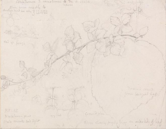 | Keywords: Samuel Palmer - Brambles - Google Art Project.jpg Inscribed in artist's hand in graphite upper left Sometimes 3 sometimes 5 on a stalk leaves These were mostly 4 Another kind has only 3 LEAVES ; in artist's hand in graphite upper right oak hedge ; in artist's hand in graphite center left end of bough ; in artist's hand in graphite lower left BRIAR Blackberry plant Stalk towards end of light ; in artist's hand in graphite lower center lying flat size A ; in artist's hand in graphite lower right Traced round from largest leaf ground plan Fibers clearly projecting on under side of leaf Inscription _Signed_and_Dated Not signed not dated Not on View Graphite on white slightly textured laid paper briar blackberry plant still life special url_id 2gEOv-SIQ254HQ PD-old-100-1923 1881 Drawings by Samuel Palmer Google Art Project works by Samuel Palmer |