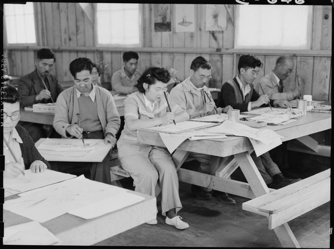| Keywords: San Bruno, California. An art school has been established at this Assembly center with a well train . . . - NARA - 537946.jpg Scope and content The full caption for this photograph reads San Bruno California An art school has been established at this Assembly center with a well trained experienced evacuee staff under the leadership of Professor Chiura Obata who before evacuation was an associate professor of art at the University of California This photograph shows part of the morning class learning free hand brush strokes General notes 537946 Local identifier 210-G-C646 Department of the Interior War Relocation Authority 02/16/1944 - 06/30/1946 NARA-Author Lange Dorothea 1895-1965 Photographer 1372774 <br /> Still Picture Records Section Special Media Archives Services Division NWCS-S National Archives at College Park 8601 Adelphi Road College Park MD 20740-6001 1942-06-16 Record group Record Group 210 Records of the War Relocation Authority 1941 - 1989 Record group ARC 537 Central Photographic File of the War Relocation Authority compiled 1942 - 1945 Series ARC 536000 File unit File unit ARC Variant control numbers NAIL Control Number NWDNS-210-G-C646 Other versions <gallery> File San_Bruno _California _An_art_school_has_been_established_at_this_Assembly_center_with_a_well_train_ _ _ _-_NARA_-_537946 tif tif File San_Bruno _California _An_art_school_has_been_established_at_this_Assembly_center_with_a_well_train_ _ _ _-_NARA_-_537946 jpg jpg </gallery> NARA-cooperation PD-USGov Dorothea Lange Tanforan Assembly Center Chiura Obata |