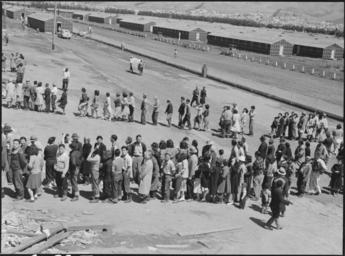 | Keywords: San Bruno, California. This assembly center has been open for two days. Bus-load after bus-load of . . . - NARA - 537678.jpg Scope and content The full caption for this photograph reads San Bruno California This assembly center has been open for two days Bus-load after bus-load of evacuated persons of Japanese ancestry are arriving this day After going through the necessary procedure for registration they are guided to the quarters assigned to them in the barracks Only one mess hall was operating this day Photograph shows line-up of newly arrived evacuees outside mess hall at noon Note barracks in background newly built in which family units are housed There are three types of quarters in this assembly center of which this is one The wide road which runs diagonally across is the former race track Industrial South San Francisco is shown in the background General notes 537678 Local identifier 210-G-C335 Department of the Interior War Relocation Authority 02/16/1944 - 06/30/1946 NARA-Author Lange Dorothea 1895-1965 Photographer 1372774 <br /> Still Picture Records Section Special Media Archives Services Division NWCS-S National Archives at College Park 8601 Adelphi Road College Park MD 20740-6001 1942-04-29 Record group Record Group 210 Records of the War Relocation Authority 1941 - 1989 Record group ARC 537 Central Photographic File of the War Relocation Authority compiled 1942 - 1945 Series ARC 536000 File unit File unit ARC Variant control numbers NAIL Control Number NWDNS-210-G-C335 Other versions <gallery> File San_Bruno _California _This_assembly_center_has_been_open_for_two_days _Bus-load_after_bus-load_of_ _ _ _-_NARA_-_537678 tif tif File San_Bruno _California _This_assembly_center_has_been_open_for_two_days _Bus-load_after_bus-load_of_ _ _ _-_NARA_-_537678 jpg jpg </gallery> NARA-cooperation PD-USGov Dorothea Lange Tanforan Assembly Center |