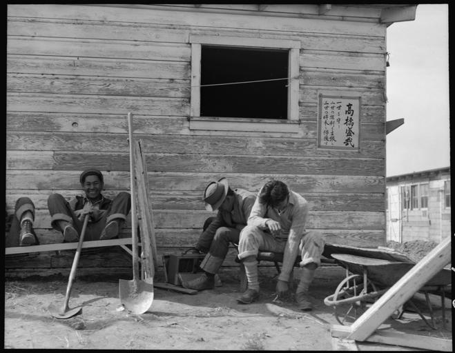 | Keywords: San Bruno, California. Time out for some of the boys on the Work Corps. All maintenance work, repa . . . - NARA - 537917.jpg Scope and content The full caption for this photograph reads San Bruno California Time out for some of the boys on the Work Corps All maintenance work repair and construction is done by volunteer evacuee workers The wages are 8 00 per month for 48 hours a week This gang of boys and young men are digging a drainage tank along one of the barracks General notes 537917 Local identifier 210-G-C617 Department of the Interior War Relocation Authority 02/16/1944 - 06/30/1946 NARA-Author Lange Dorothea 1895-1965 Photographer 1372774 <br /> Still Picture Records Section Special Media Archives Services Division NWCS-S National Archives at College Park 8601 Adelphi Road College Park MD 20740-6001 1942-06-15 Record group Record Group 210 Records of the War Relocation Authority 1941 - 1989 Record group ARC 537 Central Photographic File of the War Relocation Authority compiled 1942 - 1945 Series ARC 536000 File unit File unit ARC Variant control numbers NAIL Control Number NWDNS-210-G-C617 Other versions <gallery> File San_Bruno _California _Time_out_for_some_of_the_boys_on_the_Work_Corps _All_maintenance_work _repa_ _ _ _-_NARA_-_537917 tif tif File San_Bruno _California _Time_out_for_some_of_the_boys_on_the_Work_Corps _All_maintenance_work _repa_ _ _ _-_NARA_-_537917 jpg jpg </gallery> NARA-cooperation PD-USGov Dorothea Lange Tanforan Assembly Center |