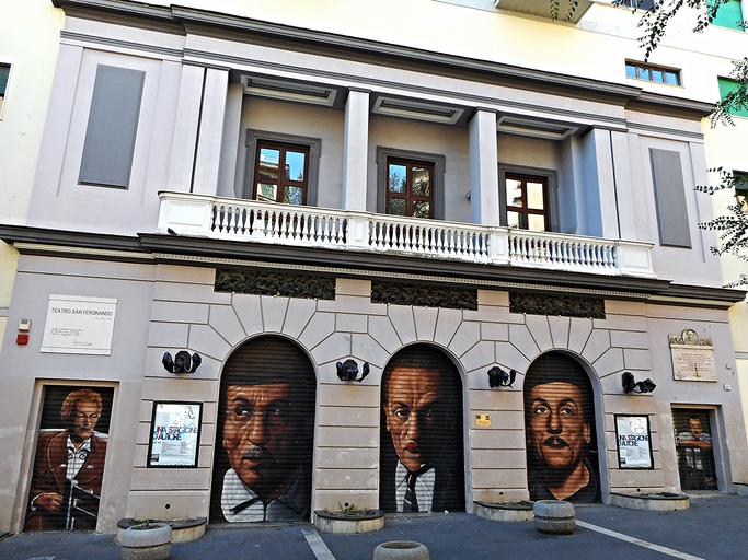 Keywords: san ferdinando theatre sanferdinandotheatre eduardo de filippo eduardodefilippo naples italy jorit agoch joritagoch architecture building facade outdoor www.flickr.com/groups/napolinobilissima/discuss/721576446... Teatro San Ferdinando a Napoli. Costruito nel 1790-91 dall'architetto Camillo Lionti, prende il nome dal sovrano Ferdinando IV di Borbone che lo volle. Aveva cinque ordini, ciascuno con tredici palchi, nonché un vestibolo con cinque grandi archi. Vi sono state rappresentate opere in musica dei maggiori compositori, tra cui nel 1790 la cantata di Paisiello "Sebeto, Argene e Fronimo", nel 1793 la commedia musicale di Giacomo Tritto "L'ordine dal disordine", ecc. Distrutto da un bombardamento aereo nel 1943, fu acquistato da Eduardo De Filippo nel '48 per tremilioni di lire e inaugurato nel 1954. Nonostante il palazzo in cui è incorporato sia in cemento armato, il teatro conserva tuttora la platea a forma di ferro di cavallo, secondo il gusto del Settecento. Recentemente le saracinesche sono state decorate da ritratti di Eduardo De Filippo, opera del pittore Jorit Agoch, napoletano di madre olandese, noto per il "San Gennaro" a Forcella. www.flickr.com/groups/napolinobilissima/discuss/721576446... Teatro San Ferdinando a Napoli. Costruito nel 1790-91 dall'architetto Camillo Lionti, prende il nome dal sovrano Ferdinando IV di Borbone che lo volle. Aveva cinque ordini, ciascuno con tredici palchi, nonché un vestibolo con cinque grandi archi. Vi sono state rappresentate opere in musica dei maggiori compositori, tra cui nel 1790 la cantata di Paisiello "Sebeto, Argene e Fronimo", nel 1793 la commedia musicale di Giacomo Tritto "L'ordine dal disordine", ecc. Distrutto da un bombardamento aereo nel 1943, fu acquistato da Eduardo De Filippo nel '48 per tremilioni di lire e inaugurato nel 1954. Nonostante il palazzo in cui è incorporato sia in cemento armato, il teatro conserva tuttora la platea a forma di ferro di cavallo, secondo il gusto del Settecento. Recentemente le saracinesche sono state decorate da ritratti di Eduardo De Filippo, opera del pittore Jorit Agoch, napoletano di madre olandese, noto per il "San Gennaro" a Forcella. |
