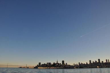 Keywords: san francisco bay area california city golden gate bridge metropole skyline bridge landmark cityscape skyscrapers evening landscape sky twilight dawn sunset blue water harbor buildings view architecture flying
