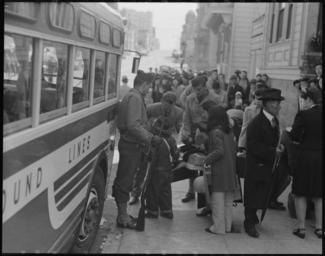| Keywords: San Francisco, California. The Japanese quarter of San Francisco on the first day of evacuation fro . . . - NARA - 537741.jpg Scope and content The full caption for this photograph reads San Francisco California The Japanese quarter of San Francisco on the first day of evacuation from this area About 660 merchants shop-keepers tradespeople professional people left their homes on this morning for the Civil Control Station from which they were dispatched by bus to the Tanforan Assembly center This photograph shows a family about to get on a bus The little boy in the new cowboy hat is having his identification tag checked by an official before boarding General notes 537741 Local identifier 210-G-C417 Department of the Interior War Relocation Authority 02/16/1944 - 06/30/1946 NARA-Author Lange Dorothea 1895-1965 Photographer 1372774 <br /> Still Picture Records Section Special Media Archives Services Division NWCS-S National Archives at College Park 8601 Adelphi Road College Park MD 20740-6001 1942-04-29 Record group Record Group 210 Records of the War Relocation Authority 1941 - 1989 Record group ARC 537 Central Photographic File of the War Relocation Authority compiled 1942 - 1945 Series ARC 536000 File unit File unit ARC Variant control numbers NAIL Control Number NWDNS-210-G-C417 Other versions <gallery> File San_Francisco _California _The_Japanese_quarter_of_San_Francisco_on_the_first_day_of_evacuation_fro_ _ _ _-_NARA_-_537741 tif tif File San_Francisco _California _The_Japanese_quarter_of_San_Francisco_on_the_first_day_of_evacuation_fro_ _ _ _-_NARA_-_537741 jpg jpg </gallery> NARA-cooperation PD-USGov Dorothea Lange Japanese American internment processing in San Francisco |
