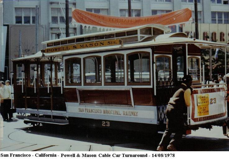 | Keywords: San Francisco - California - Powell & Mason Cable Car - 1978.jpg San Francisco - California - Powell Mason Cable Car - 1978 en Powell Mason Street Cable Car turnaround it Fermata di Powell Mason del tram a cremagliera Il tram viene fatto girare a mano su di una piattaforma girevole Roger469 San Francisco cable car no 23 1978 in San Francisco |