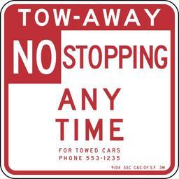 | Keywords: San Francisco No Stopping Tow Away.svg San Francisco No Stopping Any Time Tow Away sign based on SFDOT sign specs Self made based on SFDOT sign drawing 2009-04-10 own assumed Overpush~commonswiki Diagrams of road signs of California Signs in San Francisco No stopping signs United States Tow-away signs |