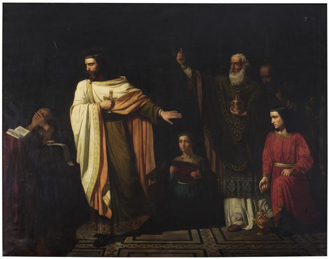 | Keywords: San Hermenegildo en la prisión (Museo del Prado).jpg  Según algunos autores esta obra que muestra al príncipe visigodo San Hermenegildo en la prisión por negarse a abandonar el catolicismo y no retornar al arrianismo acusa unas grandes deficiencias en su dibujo en su esquema compositivo y en la actitud de los personajes San Hermenegildo 564-585 era hijo del rey visigodo Leovigildo y en el año 585 fue ejecutado en Tarragona por orden de su padre Ca 1860 oil canvas Size cm 277 226 Institution Museo del Prado Depositado en la Universidad Central de Barcelona https //www museodelprado es/coleccion/obra-de-arte/san-hermenegildo-en-la-prision/761e8865-16ad-4791-91c3-30c07e53b1d7 object history exhibition history credit line accession number P06422 https //content museodelprado es/imagenes/Documentos/imgsem/76/761e/761e8865-16ad-4791-91c3-30c07e53b1d7/36007b97-cc78-47bb-b2d3-7bc5aeb8229a jpg PD-old-100 Hermenegild Francisco Aznar 19th-century paintings in the Prado Museum Edifici històric de la Universitat de Barcelona Uploaded with UploadWizard |
