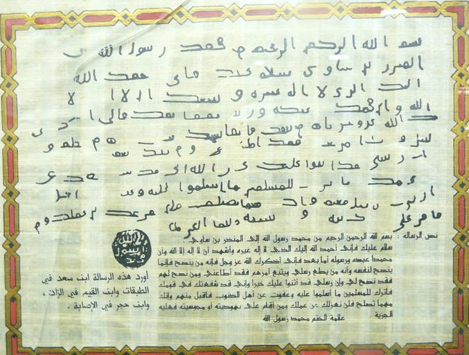 | Keywords: Sana' military museum 07.JPG en A facsimile of a letter of the prophet Muhammed to Munzir ibn Sawa Al Tamimi Below the facsimile reproduction is a modern transcription ar بعض الآثار القديمة في المتحف الحربي اليمني بصنعاء On display at the military museum of Yemen in Sana'a own photograph Email4mobile 2010-02-08 photograph File Muhammad Bahrain letter facsimile png Yemen Military Museum Manuscript letters written messages History of Muhammad Arabic texts | ||||