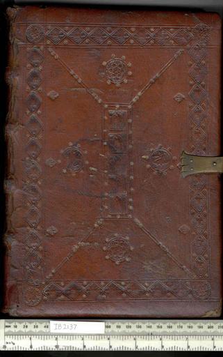 Keywords: Sancti Bonaventure tractatus - Upper cover (IB2137).jpg Style Single tools design; Caption Upper cover; Colour Brown; Edge Unspecified exhibition history Decorative Technique Tooled in blind Tooled in gold; Cover Material Goatskin includes morocco turkey etc Wooden boards 1 pair of clasps 4 raised bands double Tabs Tooled to a different design on each cover Carthusians of S Alban Trier 1335-1794 Typed document in BL office copy of BMC signed by Kyriss attributed this binding to this workshop object history Text 1489; Strassburg; Carthusians of S Alban Trier 1335-1794 object type Cc-zero place of creation Binding Germany place of discovery BMC I 150 British Library image http //www bl uk/catalogues/bookbindings/LargeImage aspx RecordId 020-000004372 ImageId ImageId 41791 Copyright BL Sancti Bonaventure tractatus Uploaded with GWToolset Sancti Bonaventure tractatus - Upper cover IB2137 http //www webarchive org uk/bldatasets/bindings/6336_4 jpg Bookbinding 15th-century bookbinding British Library Bookbindings |