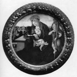 | Keywords: Sandro Botticelli - Madonna and Child with the Young Saint John the Baptist - Walters 37422.jpg This tondo round painting depicts the Virgo lactans which is the Latin term for the nursing Virgin Mary The image testifies to the humanity of Christ as it shows that he consumed food like all other humans Mary is seated on the ground In this pose she is known as the Madonna of Humility The young Saint John the Baptist Jesus' second cousin gazes reverently at Christ John the Baptist was the patron saint of Florence and the painting comes from the Florentine artist Sandro Botticelli's workshop as can be seen in its graceful contours so it was most likely painted for a patron from that city A tondo was not used as an altarpiece and could be hung in a private home For more information on this tondo please see Zeri catalogue number 58 p 94 between 1495 1499 Renaissance tempera and oil on wood panel Painted surface Diam 36 13/16 x D 1 7/16 in 93 5 x 3 7 cm accession number 37 422 15551 Don Marcello Massarenti Collection Rome date and mode of acquisition unknown 1897 catalogue no 31 as Botticelli Henry Walters city Baltimore Walters Art Museum Henry Walters Acquired by Henry Walters with the Massarenti Collection 1902 place of origin Florence Italy Walters Art Museum license 3D Madonna and Child with Saint John Botticelli Italian Renaissance paintings in the Walters Art Museum Paintings in the Walters Art Museum Media contributed by the Walters Art Museum needs artist update 15th-century paintings of Madonna and Child with the Infant Saint John Black and white reproductions of paintings in color Paintings of John the Baptist holding a cross Round paintings of Madonna and Child Tondo |