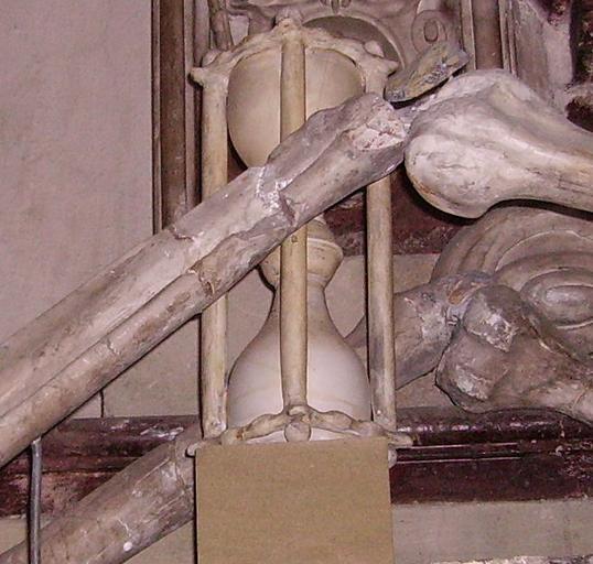 Keywords: Sanduhr Michelsberg Bamberg.jpg Description skeleteon in a church of Bamberg Germany Source own photography --Immanuel Giel 09 49 19 April 2006 UTC Heilig-Grab-Kapelle im Kloster Michelsberg Hourglasses in art
