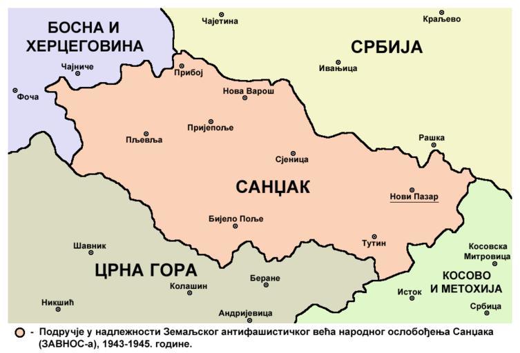 | Keywords: Sandzak 1943 1945 sr.png English Area under jurisdiction of the National Anti-Fascist Council of the People's Liberation of Sandžak ZAVNOS 1943-1945 Serbian Под учје у надлежности Земаљског антифашистичког већа на одног ослобођења Санџака ЗАВ ОС-а 1943-1945 године 2014-11-01 own assumed PANONIAN Author User PANONIAN Own work Date 2014 Cc-zero References http //www avlija me/historija/sandzak-u-drugom-svjetskom-ratu http //www sandzacke rs/sandzak/historija/zemaljsko-antifasisticko-vijece-narodnog-oslobodenja-sandzaka-zavnos/ http //www islamskazajednica org/index php option com_ezine task read page 5 category 24 article 4688 http //sandzakpress net/autonomija-sandzaka- E2 80 93-historijski-i-politicki-kontekst Dr Života Marković Partizansko-četnički odnosi i privremena saradnja u Srbiji 1941 godine Užice 2010 Maps of the history of Sandžak Maps of the history of Montenegro in modern times Maps of Serbia during World War II Maps of Montenegro during World War II Maps of Yugoslavia during World War II Maps in Serbian |