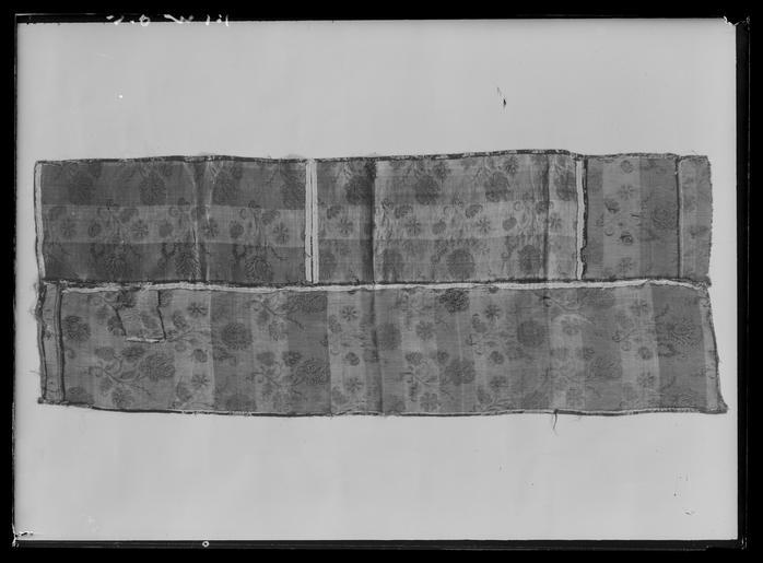 | Keywords: Sängomhänge, Torpa stenhus - Livrustkammaren - 10496.tif LSH artwork sv Del av sängomhänge till stolpsäng Sängomhänget består av fyra våder De två yttre och en av mittvåderna är i benvitt siden med invävt mönster i form av stiliserade blommor i geometriska former Den andra mittvåden är av svart sidenatlas med invävda blomsterkvistar i gul cerise vit och grön silke Överst är den svarta våden lappad med en remsa i samma tyg Vit vådbredd ytterst 465 mm i mitten 225 mm Svart vådbredd 500 mm <br/>Franskant runt om långsidorna och nedre kortsidan av svart beige och vit silke bredd 18 mm <br/>Längs överkanten elva metallringar av vilka nio är av gul grövre metall med raka kanter Två är av vit metall Fästa med beigefärgat garn eller beige/svarta sidenband original caption silk Färg benvit vit d1 - dräkt - yttermaterial material siden - silk Färg svart gul cerise vit grön d1 - dräkt - yttermaterial material sidenatlas - silk Färg svart beige vit d4 - dräkt - passpoaler band kantning uppslag material silkesfrans - metal Färg gul vit d5 - dräkt - knappar och spännen material metall - yarn Färg beige d5 - dräkt - knappar och spännen material garn - silk Färg beige svart d5 - dräkt - knappar och spännen material sidenband g 560 size mm 1720 1690 LRK Himmelssängar place of origin original filename LN_B16491_019371 56192 inventory number LRK 19612 10496 CC0 Sängomhänge Torpa stenhus - Livrustkammaren - 10496-negative tif <gallery caption Different images of same object > File Sängomhänge Torpa stenhus - Livrustkammaren - 44739 tif File Sängomhänge Torpa stenhus - Livrustkammaren - 36181 tif File Sängomhänge Torpa stenhus - Livrustkammaren - 61861 tif File Sängomhänge Torpa stenhus - Livrustkammaren - 53300 tif File Sängomhänge Torpa stenhus - Livrustkammaren - 19058 tif File Sängomhänge Torpa stenhus - Livrustkammaren - 78982 tif File Sängomhänge Torpa stenhus - Livrustkammaren - 70423 tif File Sängomhänge Torpa stenhus - Livrustkammaren - 27620 tif </gallery> Media contributed by LSH without any categories Media contributed by LSH unmatched objKeyword Media contributed by LSH 2014-11 |