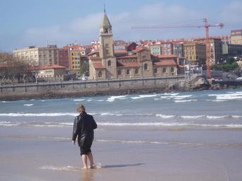 Keywords: Sanlorenzoysanpedro.JPG Playa de San Lorenzo en Gijón Asturias España con la iglesia parroquial de San Pedro Apóstol al fondo own 2006-05-16 I V Church of San Pedro Gijon Playa de San Lorenzo Gijón