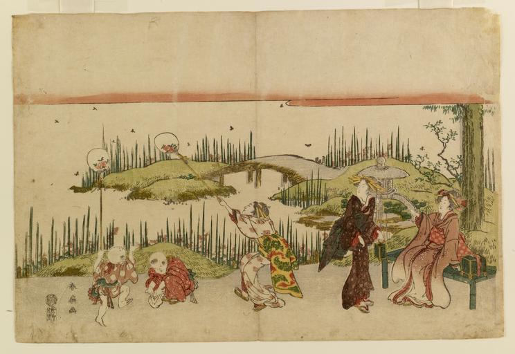 | Keywords: Sanoki - Women and Children Catching Fireflies - Walters 95170.jpg Ladies in elegant kimonos and elaborate coiffures enjoy themselves catching fireflies with their children in the Kenrokuen Garden in Kanazawa The color and fluidity of movement of the five small figures arrayed across the foreground set them apart from the plain stylized landscape The Kenrokuen Garden can still be visited today; the decorative lantern on the right adorns the same bridge after 200 years between 1806 1830 Edo pigments mulberry paper cm 26 38 3 accession number 95 170 11673 Justine Lewis Keidel date and mode of acquisition unknown Walters Art Museum Gift of Justine Lewis Keidel 1986 Signature Shunsen ga place of origin Japan Walters Art Museum license 2D Japanese prints in the Walters Art Museum Historic samurai prints Media contributed by the Walters Art Museum needs category review Katsukawa Shunsen |