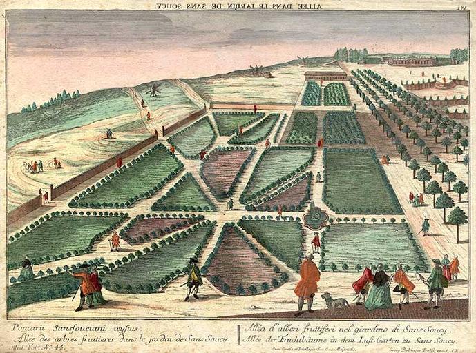 Keywords: Sanssouci Fruchtbäume.jpg Allée der Fruchtbäume in dem Lust-Garten zu Sans Soucy Coloured engraving Image dimensions 10 3/4 x 16 inches Allée des arbres fruitiers dans le jardin de Sans Soucy Alléa d'alberi fruttiferi nel giardino di Sans Soucy http //www donaldheald com/ Georg Balthasar Probst 1731-1801 um 1747-1749 PD-old-100 Georg Balthasar Probst 1673-1748 History of Sanssouci Potsdam in the 18th century |