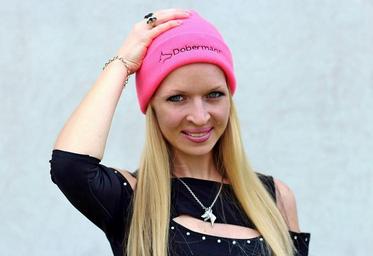 Keywords: sapien woman blonde doberman hat pink