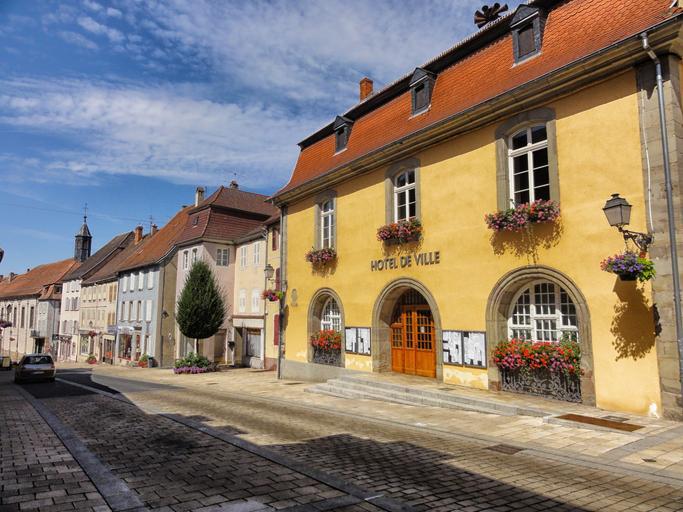 Keywords: sarre-union france town village buildings street sidewalk skyline sky clouds outside architecture scenic flowers