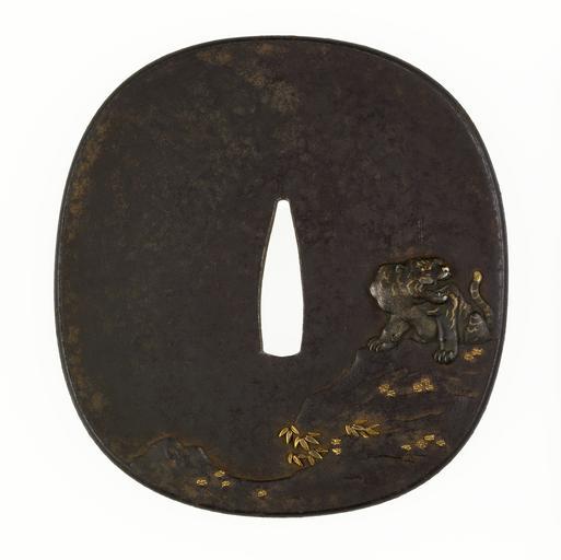 | Keywords: Sasayama Tokuoki - Tsuba with a Tiger on a Cliff - Walters 51146.jpg On the right side of this tsuba a tiger is perched on a cliff While tigers are not native to Japan they have long been known through Chinese painting The tiger is often a symbol of strength The reverse of this tsuba shows two pine trees under a gibbous moon between 1813 1896 late Edo-Meiji iron shibuichi gold silver shakudo cm 8 35 7 88 0 45 accession number 51 146 1378 Henry Walters Baltimore date and mode of acquisition unknown Walters Art Museum Henry Walters Acquired by Henry Walters Signature Ikkôsai Tokuoki place of origin Kyoto Japan Walters Art Museum license Tsuba in the Walters Art Museum Sasayama Tokuoki Media contributed by the Walters Art Museum needs category review |