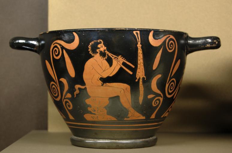 Keywords: Satyros aulos Louvre MNE987.jpg Creusa Painter Pintor de Creusa Satyr playing the aulos Side A from an Lucanian Metapontium red-figure skyphos ca 400 “390 BC Sátiro tocando el aulós en un esquifo Procedencia Metaponto Lucania Cara A de un esquifo de figuras rojas 400-390 a C Satyre jouant de l'aulos Face A d'un skyphos lucanien Métaponte à figures rouges vers 400-390 av J -C H 13 8 cm 5 ¼ in Diam 26 4 cm 10 ¼ in W 18 3 cm 7 in Museum Louvre Department of Greek Etruscan and Roman Antiquities Sully wing room 44 case 8 object history credit line Gift of Dietrich von Bothmer 1993 accession number MNE 987 User Bibi Saint-Pol own work 2007-06-15 other versions <gallery>File Satyre jouant de l'aulos musée du Louvre jpg </gallery> Auloi in ancient Greek pottery Satyrs in ancient Greek pottery Ancient Greek pottery skyphoi Creusa Painter Greek antiquities in the Louvre - Room 44 400s BC pottery in France 390s BC pottery in France |