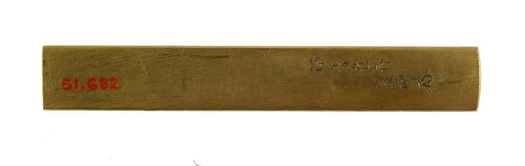 Keywords: Sawa Yoshisato - Kozuka with Foreign Ships - Walters 51682 - Back.jpg This kozuka was made in Nagasaki the main port during Japan's period of restricted foreign interchange between the 1630s and the 1850s Most of Japan's foreign trade during that time occurred through Nagasaki The large boat in the center is a Dutch ship The flag at its left is either the Dutch tricolor or the flag of the Dutch East Indies Company which used the tricolor as a background The two boats on the right are Chinese junks Five other small boats are in the water between the large ships These boats are tied to together and are pulling the large boat into port Part of the port can be seen behind the small boats ca 1825 late Edo shibuichi gold silver copper cm 9 8 accession number 51 682 3208 Henry Walters Baltimore date and mode of acquisition unknown Walters Art Museum Henry Walters Acquired by Henry Walters Signature Sawa JuhĂ´sai Yoshisato place of origin Nagasaki Japan Walters Art Museum license Kozuka in the Walters Art Museum Sawa Yoshisato Media contributed by the Walters Art Museum needs category review |