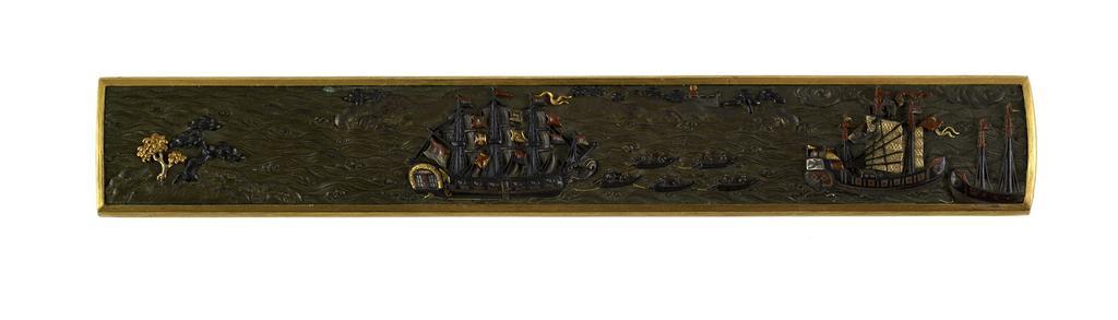 Keywords: Sawa Yoshisato - Kozuka with Foreign Ships - Walters 51682.jpg This kozuka was made in Nagasaki the main port during Japan's period of restricted foreign interchange between the 1630s and the 1850s Most of Japan's foreign trade during that time occurred through Nagasaki The large boat in the center is a Dutch ship The flag at its left is either the Dutch tricolor or the flag of the Dutch East Indies Company which used the tricolor as a background The two boats on the right are Chinese junks Five other small boats are in the water between the large ships These boats are tied to together and are pulling the large boat into port Part of the port can be seen behind the small boats ca 1825 late Edo shibuichi gold silver copper cm 9 8 accession number 51 682 3208 Henry Walters Baltimore date and mode of acquisition unknown Walters Art Museum Henry Walters Acquired by Henry Walters Signature Sawa JuhĂ´sai Yoshisato place of origin Nagasaki Japan Walters Art Museum license Kozuka in the Walters Art Museum Sawa Yoshisato Media contributed by the Walters Art Museum needs category review |