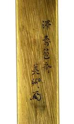 Keywords: Sawa Yoshisato - Kozuka with Foreign Ships - Walters 51682 - Mark.jpg This kozuka was made in Nagasaki the main port during Japan's period of restricted foreign interchange between the 1630s and the 1850s Most of Japan's foreign trade during that time occurred through Nagasaki The large boat in the center is a Dutch ship The flag at its left is either the Dutch tricolor or the flag of the Dutch East Indies Company which used the tricolor as a background The two boats on the right are Chinese junks Five other small boats are in the water between the large ships These boats are tied to together and are pulling the large boat into port Part of the port can be seen behind the small boats ca 1825 late Edo shibuichi gold silver copper cm 9 8 accession number 51 682 3208 Henry Walters Baltimore date and mode of acquisition unknown Walters Art Museum Henry Walters Acquired by Henry Walters Signature Sawa JuhĂ´sai Yoshisato place of origin Nagasaki Japan Walters Art Museum license Kozuka in the Walters Art Museum Sawa Yoshisato Media contributed by the Walters Art Museum needs category review |
