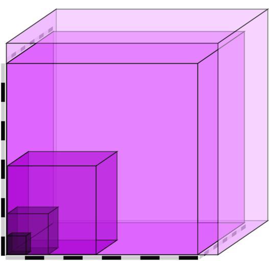 | Keywords: Scale one to thousand volume no labels.svg Comparison of one unit to one thousand units Intended to be used as an imagemap for navigating three dimensional orders of magnitude such as volume The boxes are intended to be clicked on as follows the small very dark purple bottom-left box links to the next smaller order of magnitude the dark-purple box links to the range 1 to 10 the mid-purple box links to the range 10 to 100 the light purple box links to the range 100 to 1000 units and the surrounding paler purple links to larger than 1000 units No labels version Created by me 84user using Inkscape 0 46 2008-11-06 84user Public domain thumb left same image with labels <imagemap> Image Scale one to thousand volume_no_labels svg Click on the small very dark purple bottom-left box for quantities smaller than 1 the dark purple box for 1 to 10 units the mid purple box for 10 to 100 units the light purple box for 100 to 1000 units and the paler purple surround for over 1000 units poly 0 530 0 470 62 470 62 530 1 E-6 m³ poly 0 530 0 420 119 420 119 530 1 E-5 m³ poly 0 530 0 306 236 306 236 530 1 E-4 m³ poly 0 530 0 63 497 63 497 530 1 E-3 m³ poly 0 530 0 0 530 0 530 530 1 E-2 m³ - Click this pale purple surround for volumes over 1 E-2 m³ or hover over the other boxes and select the desired range desc top-left </imagemap> Clickable images Order of magnitude Comparison diagrams |