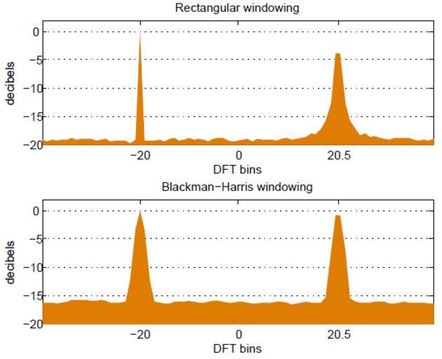 Keywords: Scalloping and noise floor comparisons (2 window functions).png en Comparison of two window functions in terms of their effects on equal-strength sinusoids with additive noise The noise floor is smoothed by averaging many DFTs to reveal the substantial difference in levels caused by the different window functions The sinusoid at bin -20 suffers no scalloping and the one at bin +20 5 exhibits worst-case scalloping The rectangular window produces the most scalloping but also narrower peaks and lower noise-floor A third sinusoid with amplitude -16 dB would be noticeable in the upper spectrum but not in the lower spectrum 2011-12-19 I created this image myself using Matlab tools and JASC Paintshop Pro to create the png file Bob K See also This figure was superceded by File Processing losses for 3 window functions gif Matlab commands <source lang Matlab > N 256; sams_per_fft; window1 rectwin N '/sum rectwin N ; window2 blackmanharris N '/sum blackmanharris N ; Fs N; sams_per_sec; HzPerBin Fs/N; F1 -20 0 HzPerBin; bin -20 F2 +20 5 HzPerBin; bin 20 5 L 100000; n 1 L; x exp j 2 pi F1/Fs n + exp j 2 pi F2/Fs n ; x x + randn 1 L +j randn 1 L 1 4; sams_per_offset 0 75 N; overlap 25 number of samples available beyond just one FFT excess_sams length x - N; j1 floor excess_sams / sams_per_offset ; sams_per_offset floor excess_sams / j1 ; num_ffts 1 + j1; define the first block of data samples 1 N; amplitude1 zeros 1 N ; amplitude2 zeros 1 N ; Loop over all the available blocks for j1 1 num_ffts amplitude1 amplitude1 + abs fft x samples window1 ; amplitude2 amplitude2 + abs fft x samples window2 ; samples samples + sams_per_offset; end warning off MATLAB log logOfZero amplitude1 20 log10 fftshift amplitude1/num_ffts ; amplitude2 20 log10 fftshift amplitude2/num_ffts ; abscissa -40 40; figure subplot 2 1 1 ; h area abscissa amplitude1 abscissa +N/2+1 'FaceColor' 871 49 0 'Linestyle' 'none' set h 'BaseValue' -20 xlim -40 40 ylim -20 2 set gca 'XTick' -20 0 20 5 set gca 'YGrid' 'on' xlabel 'DFT bins' ylabel 'decibels' title 'Rectangular windowing' ; subplot 2 1 2 ; h area abscissa amplitude2 abscissa +N/2+1 'FaceColor' 871 49 0 'Linestyle' 'none' set h 'BaseValue' -20 xlim -40 40 ylim -20 2 set gca 'XTick' -20 0 20 5 set gca 'YGrid' 'on' xlabel 'DFT bins' ylabel 'decibels' title 'Blackman-Harris windowing' ; </source> cc-zero Uploaded with UploadWizard Signal processing Fourier analysis |