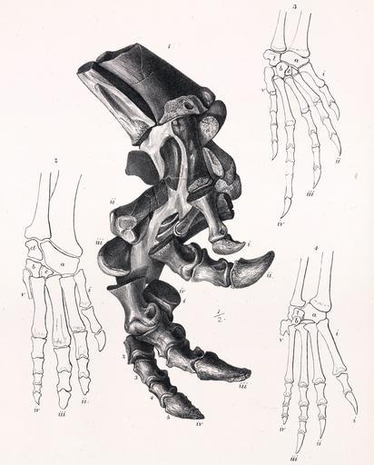 Keywords: Scelidosaurus leg.jpg Scelidosaurus Harrisonii Fig 1 Side view of bones of the right hind foot; half natural size Fig 2 Reduced diagrammatic outline of bones of hind foot Scelidosaurus Fig 3 Ib ib of a monitor lizard Varanus Fig 4 Ib ib of a crocodile Crocodilus http //www lib utexas edu/books/britfossils/html/txu-oclc-13370987-4-dinosauria-plate58 php s 1860 Jos Dinkel J Erxleben PD-old-70-1923 Check categories 2013 October 30 Scelidosaurus fossils |