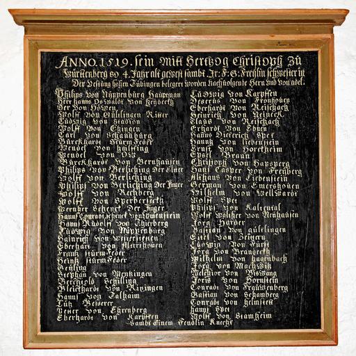 Keywords: Schandtafel im Tübinger Schloss.JPG de Sogenannte Schandtafel im Tübinger Schloss Nachdem Herzog Ulrich von Württemberg 1534 sein Herzogtum zurückerobert hatte und nach Tübingen zurückgekehrt war war er über die kampflose Aufgabe der Tübinger Festung immer noch so verärgert dass er die seiner Meinung nach feigen und vertragsbrüchigen Adligen bis in alle Ewigkeit brandmarken wollte Er ließ die Namen dieser Ritter in goldenen Buchstaben auf eine schwarze žSchandtafel schreiben die daraufhin für jedermann sichtbar im Rittersaal von Schloss Hohentübingen angebracht wurde ANNO 1519 sein mitt Herzog Christoph zu Württemberg so 4 Jahr alt gewest sambt Jr F G Freulin Schwester in Der Vestung hohen Tübingen belegert worden nachfolgende Hern und von adel <br> Philips von Nüppenburg Hauptman <br> Herr Hans Oswald von Heydeck <br> Der von Höwen <br> Wolf von Gültlingen Ritter <br> Ludwig von Stadion <br> Wolf von Ehingen <br> Carl von Schaunburg <br> Burkhardt Sturmfeder <br> Wendel von Hailfing <br> Wendel von Ow <br> Burckhardt von Bernhausen <br> Philips von Berliching Der Eltter <br> Wolf von Berliching <br> Philips von Berliching der Jünger <br> Wolf von Rechberg <br> Wolf von Sperberseck <br> Werner Schenck Der Jünger <br> Hanns Conradt Schenck von Löwenstein <br> Hans Rudolff von Thierberg <br> Ludwig von Nüppenburg <br> Hainrich von Westerstetten <br> Eberhardt von Altershouen <br> Franz Sturmfeder <br> Heinz Sturmfeder <br> Geyling <br> Stephan von Mentzingen<sup>http //www deutsche-biographie de/sfz61810 html ADB</sup> <br> Berchtold Schilling <br> Bleichhardt von Ripingen <br> Hanns von Talhaim <br> Lutz Besserer <br> Petter von Ehrenberg <br> Eberhardt von Karpffen <br> Ludwig von Karpffen <br> Deserus von Fronhouen Dietrich von Fronsberg <br> Eberhardt von Reischach <br> Heinrich von Neineck<br> Claus von Reischach <br> Erhardt von Ebnen <br> Hanns Dietrich Spet <br> Hanns von Liebenstein <br> Ernst von Horckheim <br> Epsel Braun <br> Christoph von Habsperg <br> Hans Casper von Freyberg <br> Althans von Liebenstein <br> German von Emershouen <br> Wilhelm von Wellwardt <br> Wolff Spet <br> Philips von Kaltental <br> Wolf Walter von Neuhausen <br> Jörg Harder <br> Bastian von Gültlingen <br> Eitel von Zeittern <br> Ludwig von Fürst <br> Jörg von Brandeckh <br> Wilhelm von Hagenbach <br> Jörg von Machwitz <br> Melchior von Biswang <br> Doris von Hornstein <br> Conradt von Frauenberg <br> Bastian von Schamberg <br> Conradt von Helmstett <br> Hans Spet <br> Wolf von Stamheim <br> Sambt Einem Fendlin Knecht Siehe auch Johann Friedrich Eisenbach http //books google de/books id geA-AAAAcAAJ pg PA57 lpg PA57 dq Ludwig+von+N C3 BCppenburg source bl ots qJA6rVqVgX sig kJ9MVAZjd0BNnF8SCmCf2bMNT94 hl de sa X ei CzbAU9zfHezb7Aal9YDwBw ved 0CCQQ6AEwAA v onepage q Ludwig 20von 20N C3 BCppenburg f false Geschichte und Thaten Ulrichs Herzogen zu Würtemberg und Teck etc etc Berger 1754 Seite 57-58 Philipp Ludwig Hermann Röder http //books google de/books id B24AAAAAcAAJ pg PA555 lpg PA555 dq Ludwig+von+N C3 BCppenburg source bl ots FB3aL9si-r sig qeyA_mCQJPVvm4BXMGwKaX2q3YU hl de sa X ei CzbAU9zfHezb7Aal9YDwBw ved 0CCcQ6AEwAQ v onepage q Ludwig 20von 20N C3 BCppenburg f false Geographie und Statistik Wirtembergs Band 1 Korn 1787 Seite 554-556 Christian Friedrich Sattler http //books google de/books id Pec-AAAAcAAJ pg PA15 lpg PA15 dq 22Wilhelm+von+Hagenbach 22 source bl ots BENOQ0CJp4 sig CocXbCi1W_BJtQx2oAAWkImvJYM hl de sa X ei T0DCU6D8N-6e7AaVyoGYAg ved 0CCUQ6AEwAQ v onepage q 22Wilhelm 20von 20Hagenbach 22 f false Geschichte des Herzogthums Würtenberg unter der Regierung der Herzogen Zweyter Theil Mit 123 Urkunden und einigen Kupfern bestärket Band 2 Reiß 1770 Seite 14-15 1534 Tübinger Maler im Auftrag von Herzog Ulrich von Württemberg Um 1534 PD-old-100 Uploaded with UploadWizard Plaques in Tübingen 1519 in Tübingen |