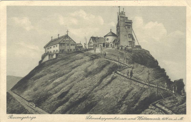 Keywords: Scheekoppenhäuser und Wetterwarte um Jahrhundertwende.jpg Schneekoppenhäuser und Wetterwarte um die Jahrhundertwende 1900 Kupfertiefdruck Old postcard Franz Pietschmann Kunstverlag Görlitz from my personal collection unknown author PD-old History of Sněžka Chapel of Saint Lawrence Śnieżka Česká bouda Sněžka Deutsche Baude Schneekoppe Meteorological observatory at Śnieżka 1900-1989 |