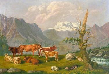 | Keywords: Scherrer Weidelandschaft.jpg  Weidelandschaft in den Schweizer Bergen mit Katarakt und Gebirgshorizont oil on canvas 65 x 95 cm zeller de Johann Kaspar Scherrer 1739 “1806 PD-art Landscape paintings of Switzerland Agriculture in art Images from Auktionshaus Zeller |