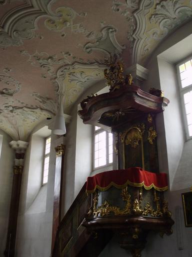 | Keywords: Schlosskapelle, Kanzel.JPG de Absberg Landkreis Weißenburg-Gunzenhausen Bayern Ehemaliges Deutschordensschloss Schlosskapelle heute Kath Pfarrkirche St Ottilia Kanzel an der Südwand own Rensi 2012-04 Saint Odile Church Absberg Pulpits in Bavaria Cc-zero |