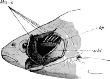 Keywords: Schlundknochen bei Cypriniden Kopf Fig 125 (Matschie et al. 1909).svg en Head of a Cyprinidae position of bones of the pharynx Fig 125 all branchial arches are cut off at the upper end the first branchial arche is kb<sub>1</sub> is turned to left kb<sub>2-4</sub> is removed to show the pharynx bone schl has the pharynx theeth at the inner side and the chewing plate kp de Lage der Schlundknochen am Kopf bei Cypriniden Fig 125 Sämtliche Kiemenbögen sind an ihrem oberen Ende abgeschnitten der erste kb<sub>1</sub> nach links vorn umgeklappt der zweite bis vierte kb<sub>2-4</sub> ganz abgetragen um den darunter liegenden žSchlundknochen schl den Träger der Schlundzähne an der Innenseite und die Kauplatte kp freizulegen P Matschie A Reichenow G Tornier P Pappenheim 1909 Mammalia Aves Reptilia Amphibia Pisces In Brauer A Hrsg Die Süsswasserfauna Deutschlands Eine Exkursionsfauna Heft 1 Gustav Fischer Verlag Jena S 206 http //www archive org/details/diessswasserfa01brau http //www archive org Mit 173 Figuren im Text P Matschie A Reichenow G Tornier P Pappenheim 1909 PD-old Cyprinidae SVG fish anatomy |