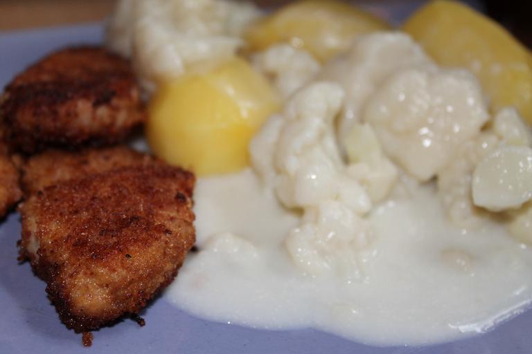 Keywords: schnitzel cauliflower vegetable cauliflower breaded meat potatoes eat cook court food