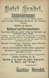 | Keywords: Schönheide im Erzgebirge Hotel Hendel 1894.jpg Schönheide im Erzgebirge Die Adressbücher für die Jahre 1894 und 1896 zu finden in der Category Historical documents of Schönheide haben eine Reihe von Anzeigen auch von Hotels und Gaststätten Dort finden sich 2015 noch bestehende Gaststätten wie die žGute Quelle der Familie Frieß und inzwischen unbekannte deren Standort kaum rekonstruierbar ist Eine reiche Gaststättenlandschaft die insbesondere im Veranstaltungsheft zur 400-Jahr-Feier des Jahres 1937 deutlich wird Ein Gasthof in Schönheiderhammer wird schon sehr früh in der Literatur erwähnt er gehörte zum Eisenhammer Das Hendel'sche Hotel brannte 1932 ab der Nachfolgebau bekam den Namen Hotel Carlshof Schönheide in the Ore Mountains Advertisements of hotels and restaurants in address books of 1894 and 1896 to find here Category Historical documents of Schönheide 1894 own Klaaschwotzer other versions pd-old Uploaded with UploadWizard Former hotels and restaurants of Schönheide |